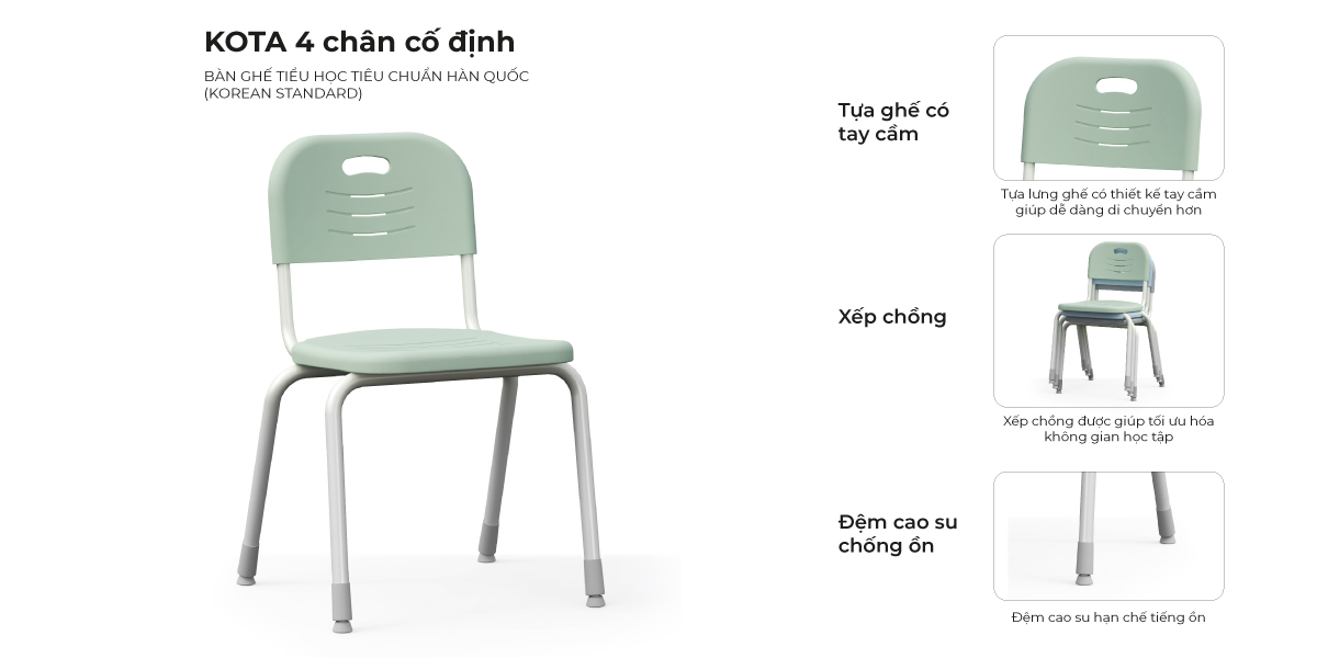 Ghế KOTA 4 chân cố định – Giải pháp ghế ngồi chuẩn cho lớp học linh hoạt Trong môi trường học tập hiện đại, một chiếc ghế không chỉ để ngồi — mà còn ảnh hưởng trực tiếp đến tư thế, sự tập trung và khả năng tương tác của học sinh. Ghế KOTA 4 chân cố định được thiết kế dành riêng cho mô hình lớp học linh hoạt, giúp học sinh dễ dàng học cá nhân, thảo luận nhóm và di chuyển trong cùng một không gian.